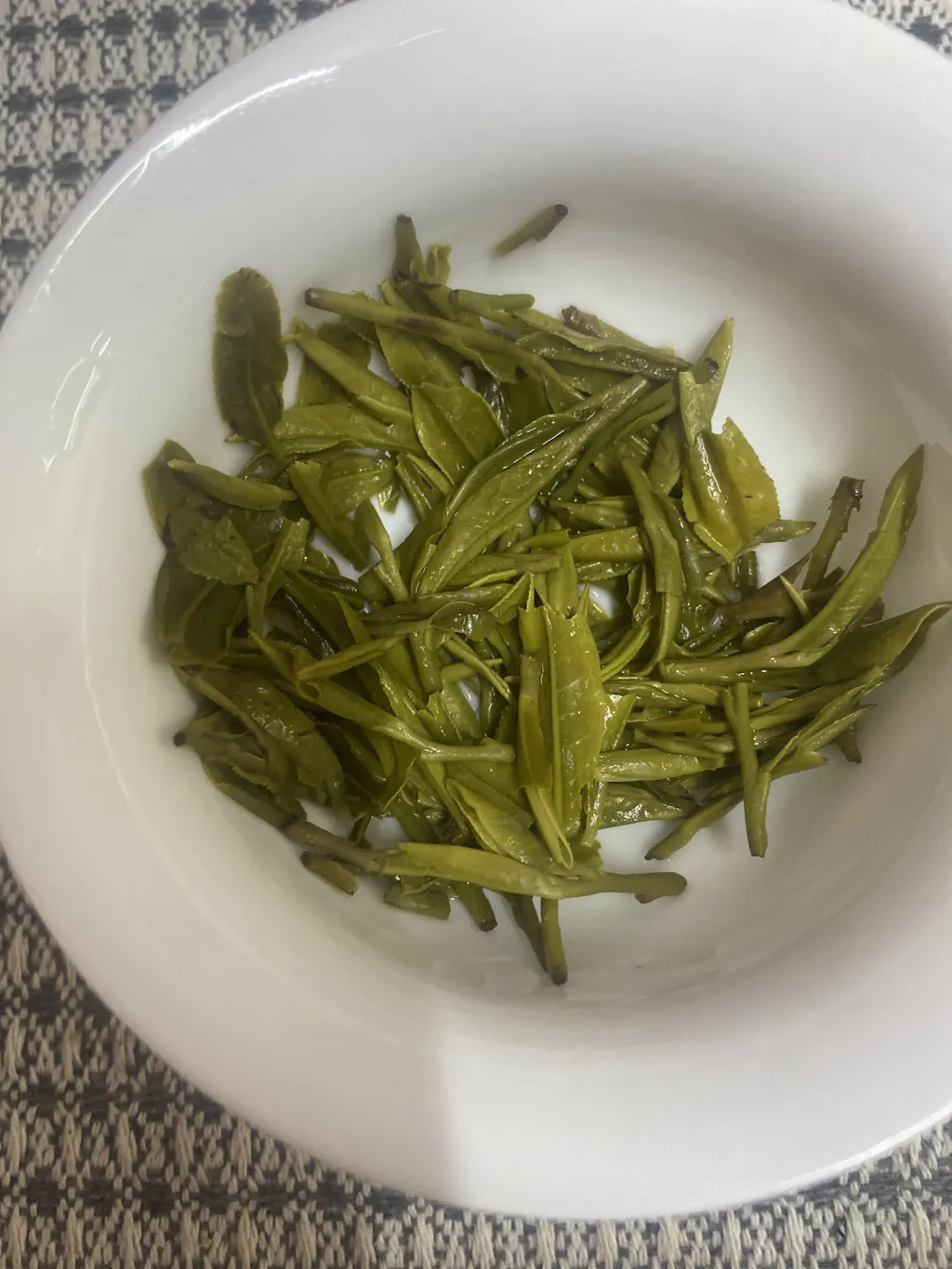 외형:납작한 형(扁形), 솜털이 있음(显毫),연한 초녹색(呈嫩绿色)