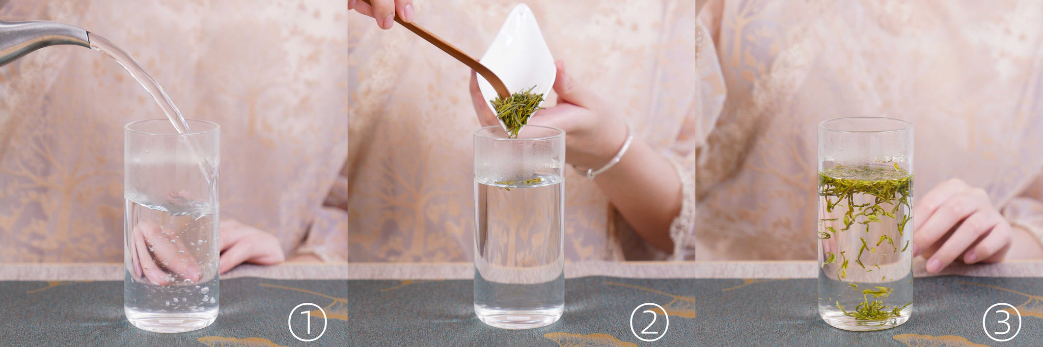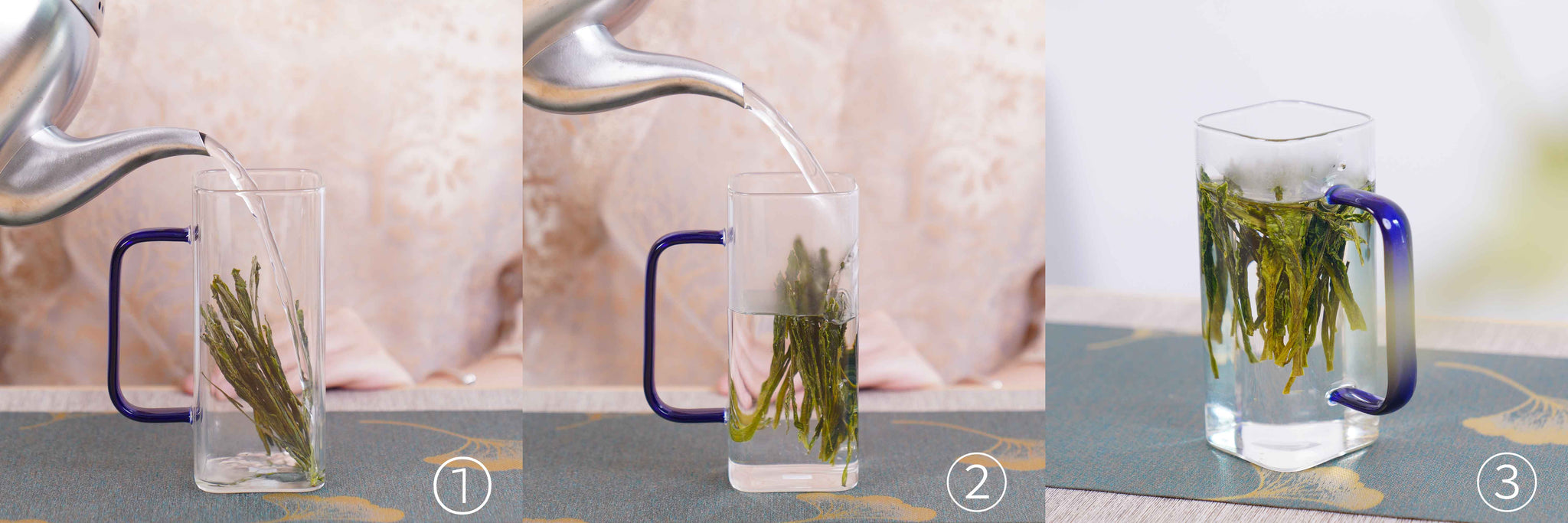 This method is suitable for green teas made from shaped or picked leaves, such as Taiping Houkui太平猴魁. Add tea first and then water, it is easier to separate out the substances contained in tea and keep the taste fresh.