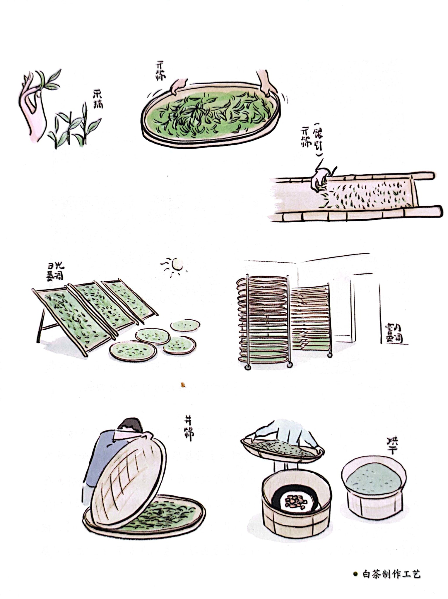 After the buds of the tea tree are picked, they are naturally spread out to remove most of the moisture inside the tea, and after reaching a dry and storable state, they can become the prototype of white tea. The process of drying is called "withering"萎凋, and the process of losing water is called "drying"干燥.